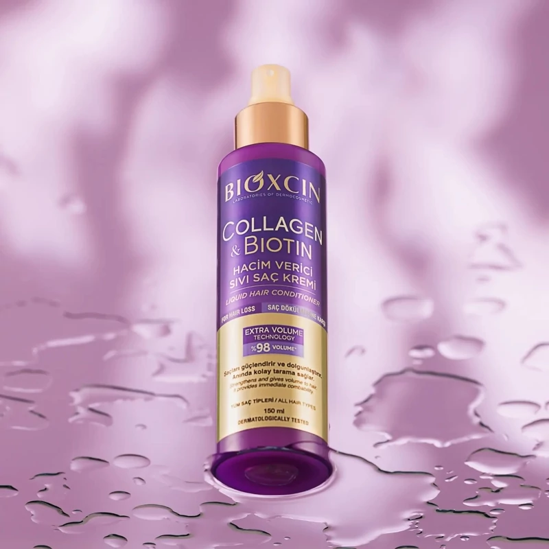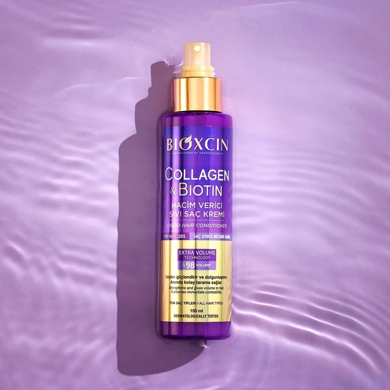 اسپری دو فاز حجم دهنده بیوکسین BIOXCIN مدل کلاژن بیوتین colagen & biotin دارای فناوری نو آورانه حجم دهی اضافی و سیستم ضد ریزش می باشد
